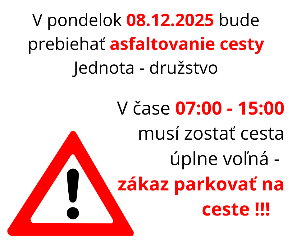 V pondelok 08.12.2025 v čase od 07:00 do 15:00 prosíme neparkovať na ceste Jednota - družstvo!!! Bude prebiehať asfaltovanie cesty. V utorok 09.12.2025 sa budú robiť nábehy vjazdov.