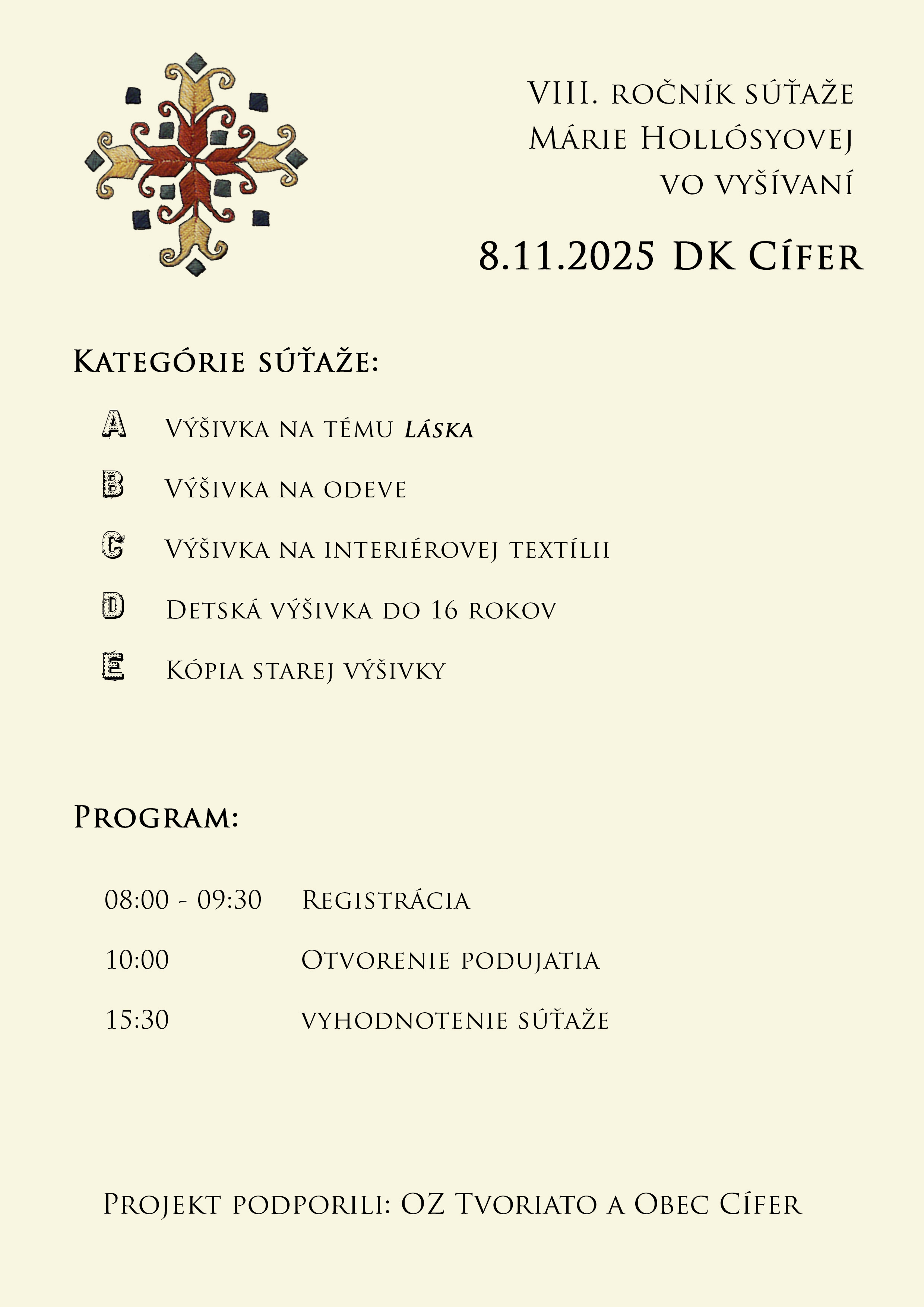 OZ TVORIATO v spolupráci s obcou Cífer organizuje ôsmy ročník súťaže vo vyšívaní. Všetky podrobnosti o súťaži nájdete na priloženom plagáte.